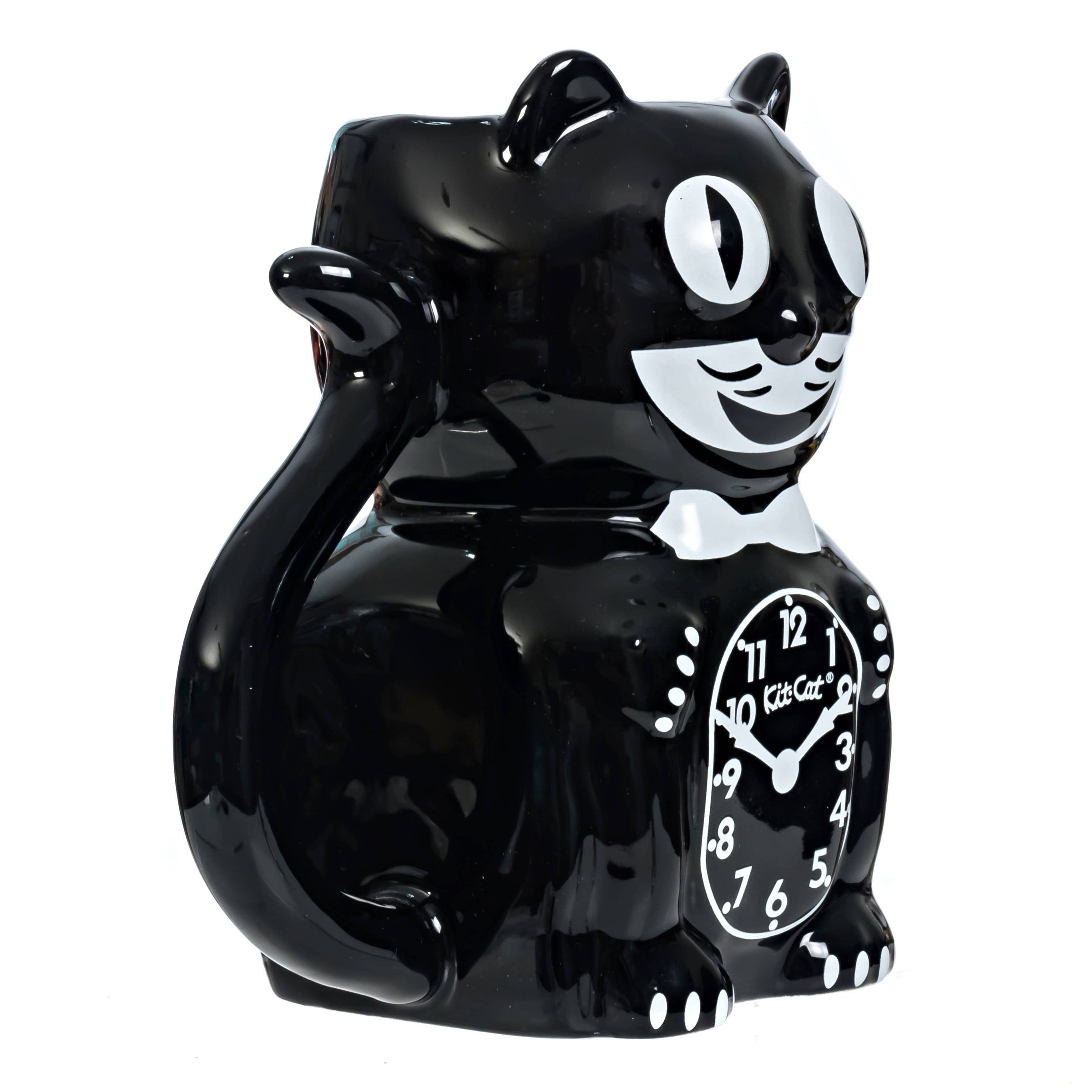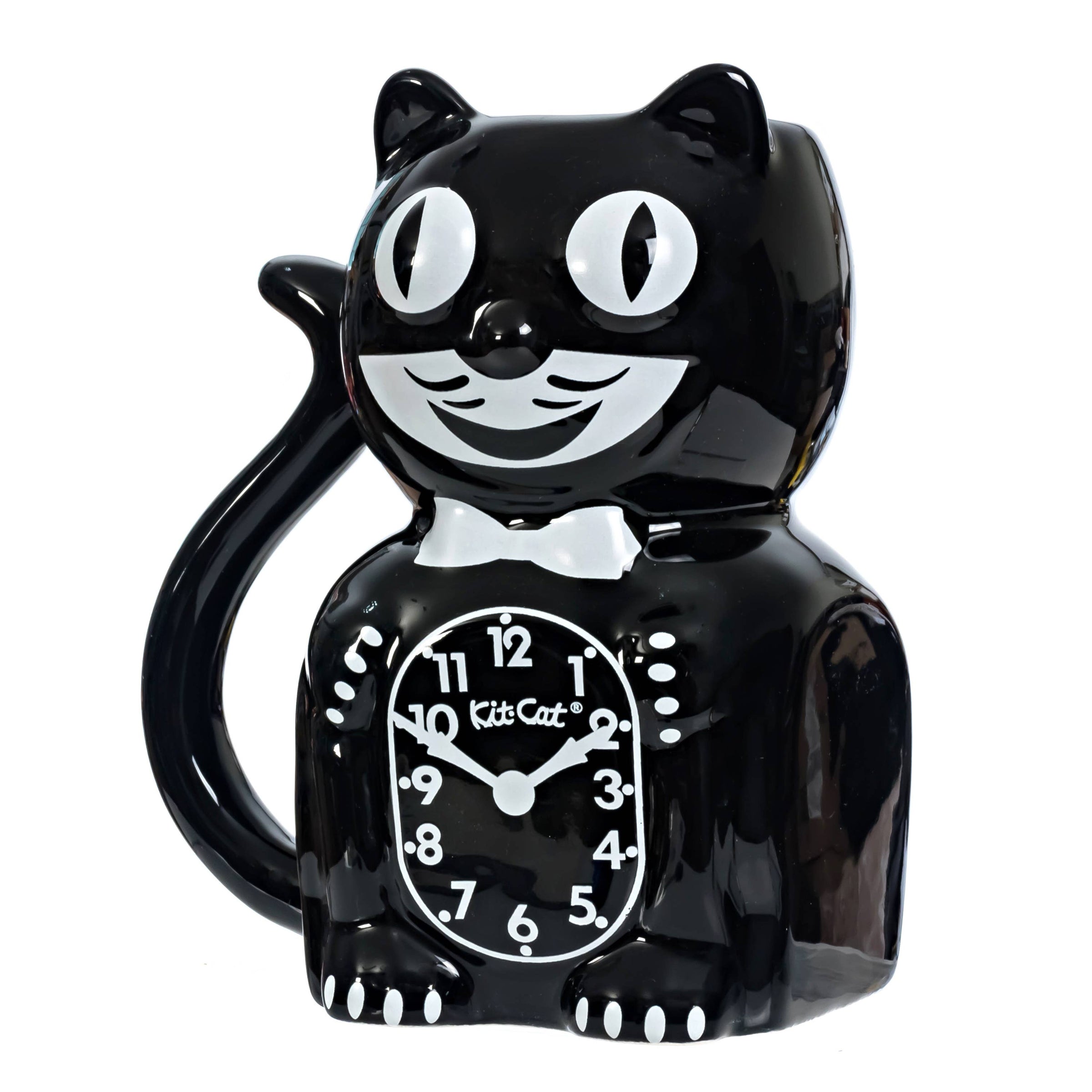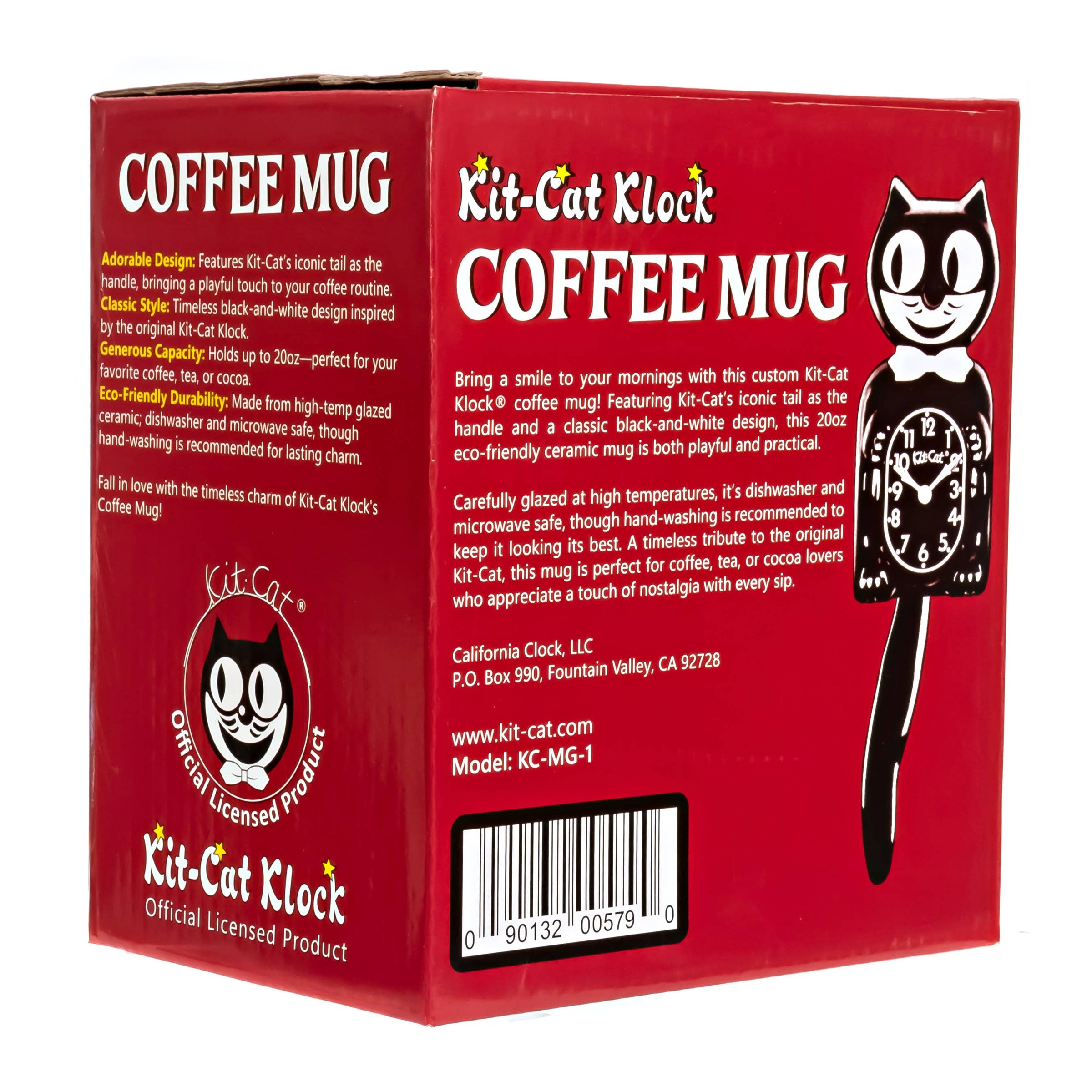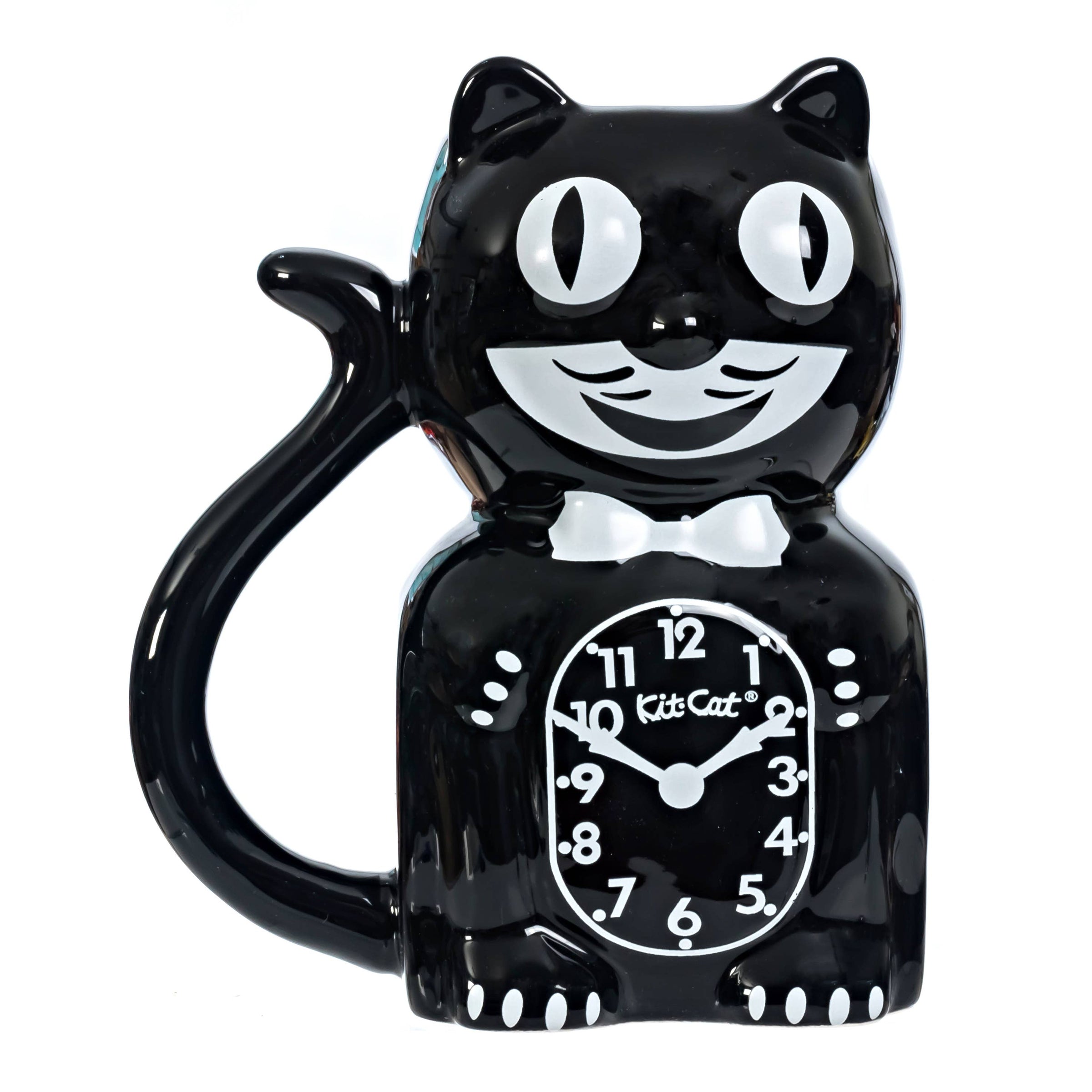 This Kit-Cat Klock coffee mug brings playful charm to your daily routine with the iconic Kit-Cat tail reimagined as a handle. Featuring a classic black-and-white design inspired by the original Kit-Cat Klock, it holds up to 20 oz and is perfect for coffee, tea, or cocoa. Made from high-temperature glazed ceramic, it is durable, dishwasher and microwave safe, though handwashing is recommended to keep it looking its best. A timeless and nostalgic piece for Kit-Cat fans and collectors alike.