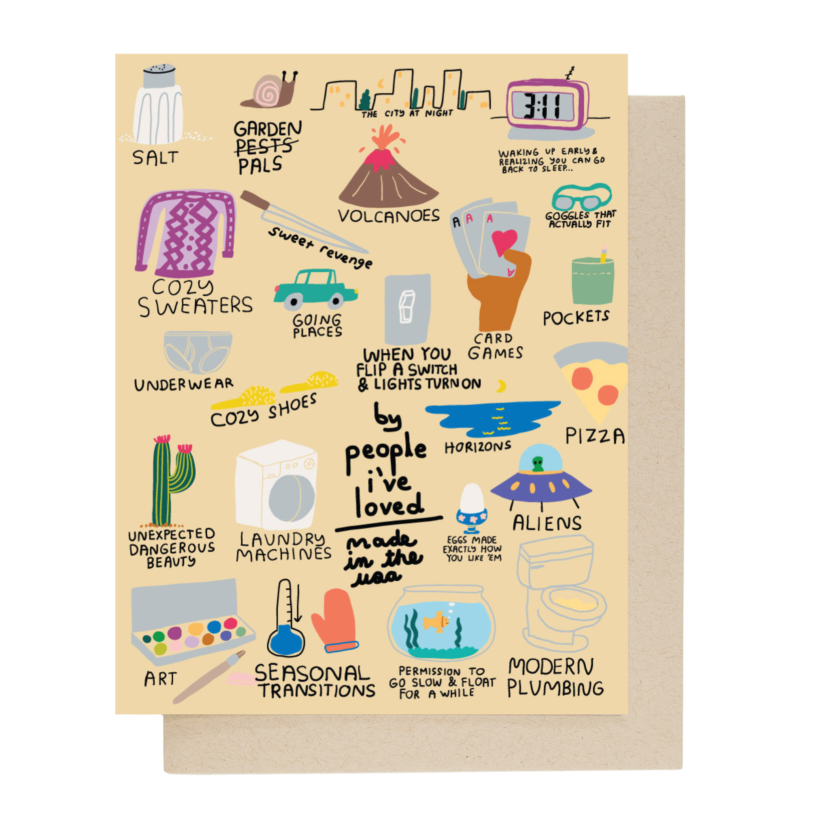 A celebration of all the good little things that carry us through. From haircuts to hot tea, from socks to aliens — this card is a reminder that magic is hiding everywhere. 3.5 x 5 inches Digitally printed greeting card on archival-quality card stock with a kraft envelope.