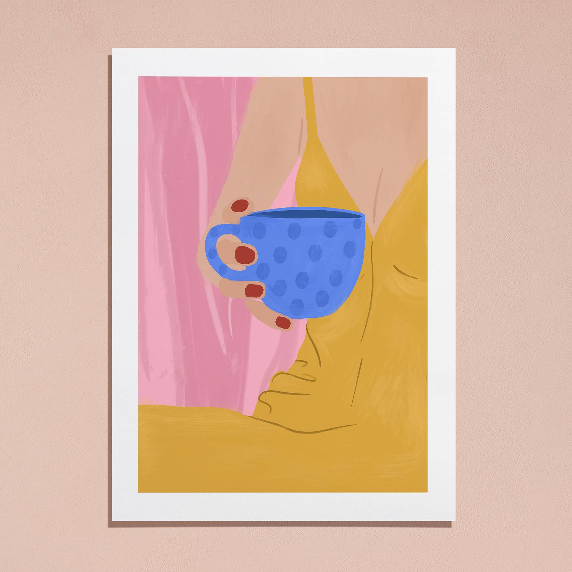 A vibrant and intimate moment—this illustration captures a woman in a flowing yellow dress, holding a blue polka-dotted cup against a soft pink backdrop. Bold colors meet quiet comfort. Printed on 200gsm fine art paper, individually packaged for gifting or display.
