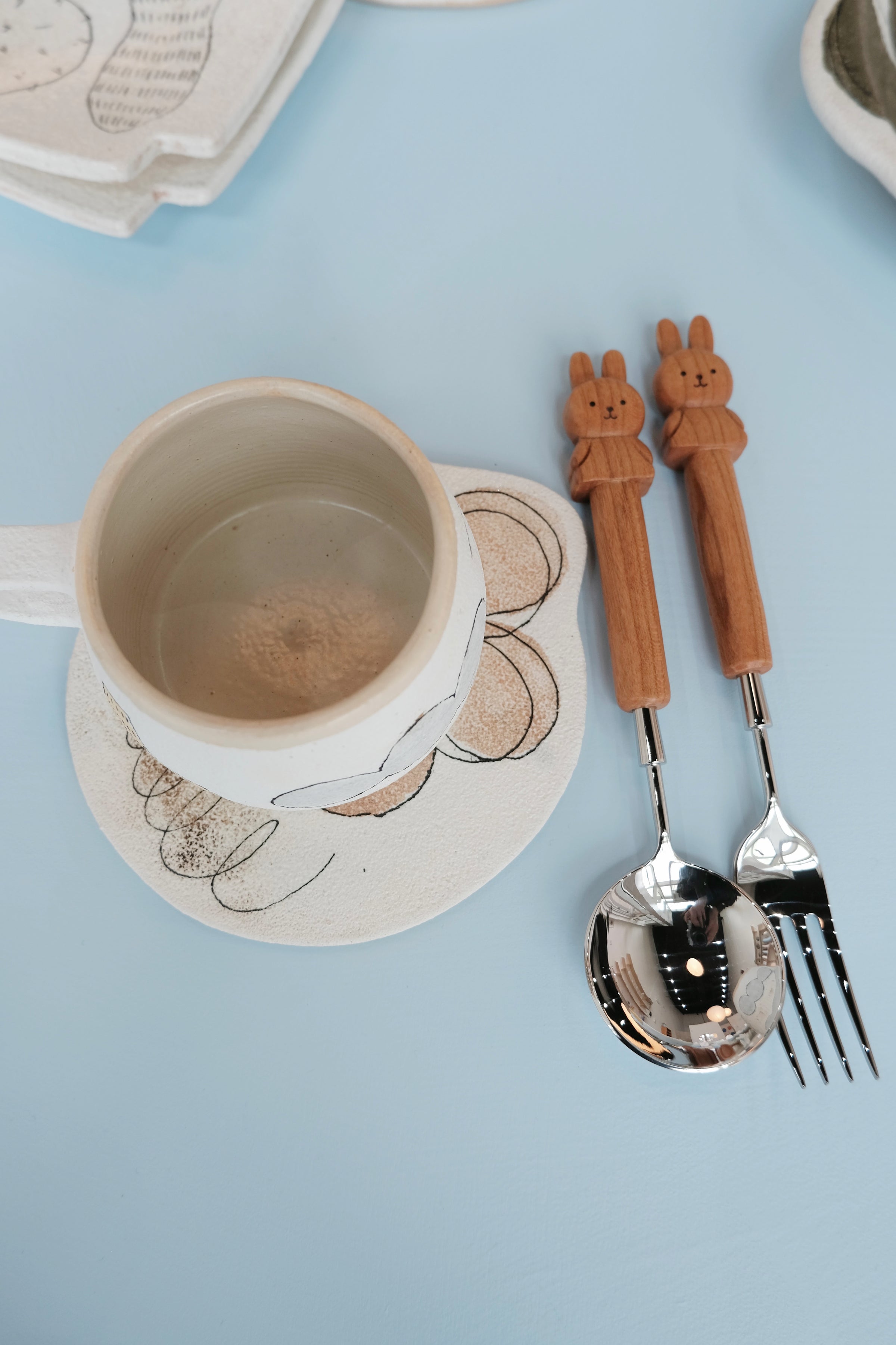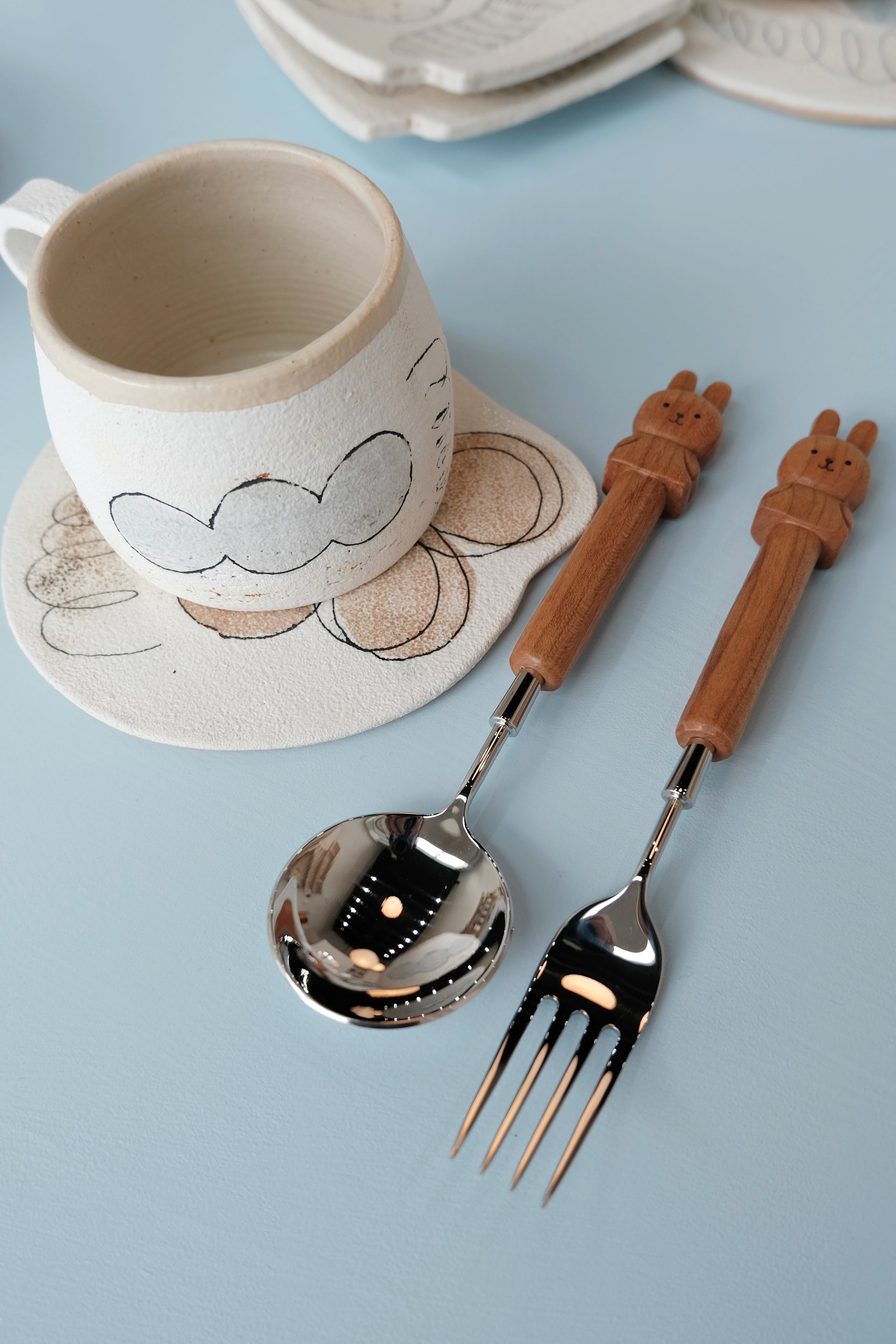 Add a gentle touch of charm to your table with this handcrafted bunny fork or spoon. Featuring a sweet bunny with folded paws and tall ears atop a natural wood handle, this piece combines functionality with whimsical elegance. Perfect for both kids and adults who love thoughtful details.