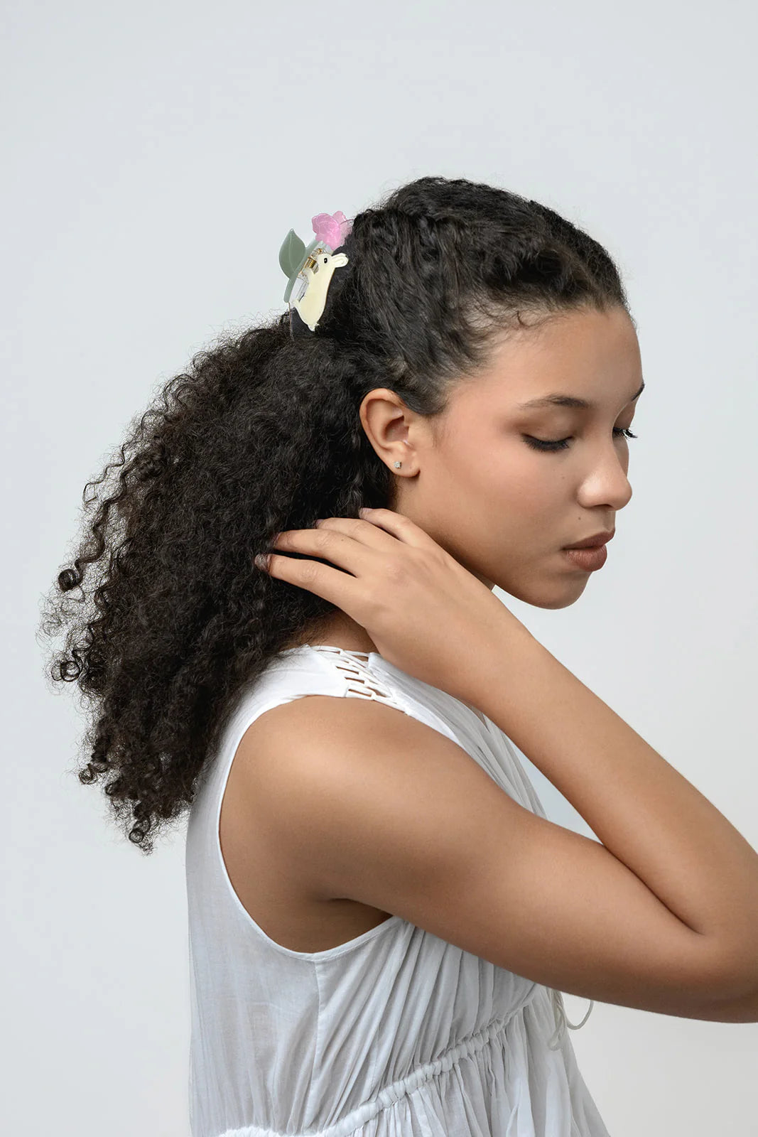 A cream-colored bunny rises on its haunches, offering a soft pink peony in the sweetest little scene. Set on a clear acetate base, the design seems to float effortlessly in your hair. This mid-sized claw is full of charming details, from the delicate flower to the tiniest sparkling rhinestone eye.
