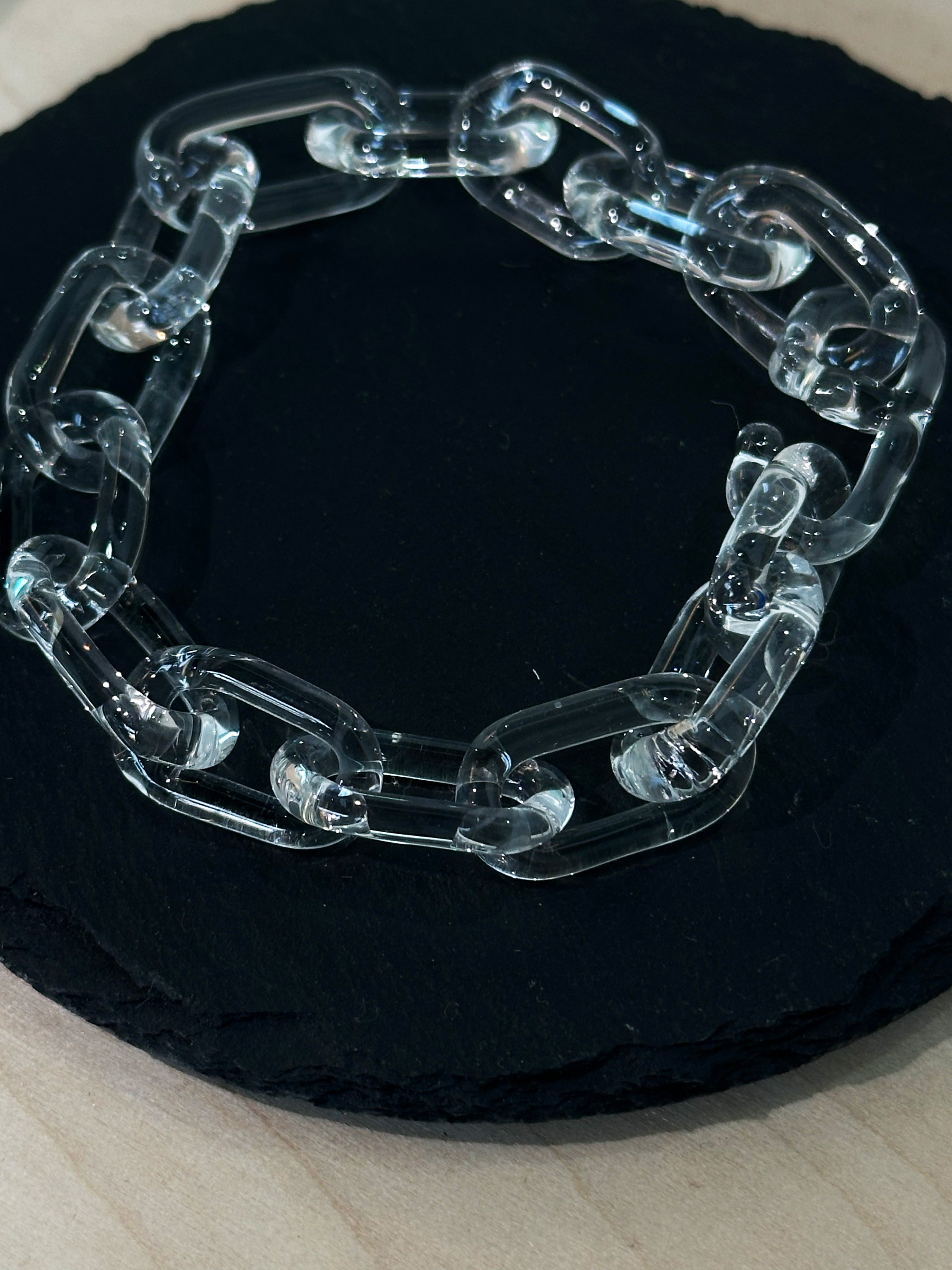 Handcrafted from borosilicate glass, the Glass Chain Bracelet transforms the familiar form of a chain into something delicate and ethereal. Each link is individually flame-worked, joining seamlessly to create a sculptural piece that plays with light and transparency.