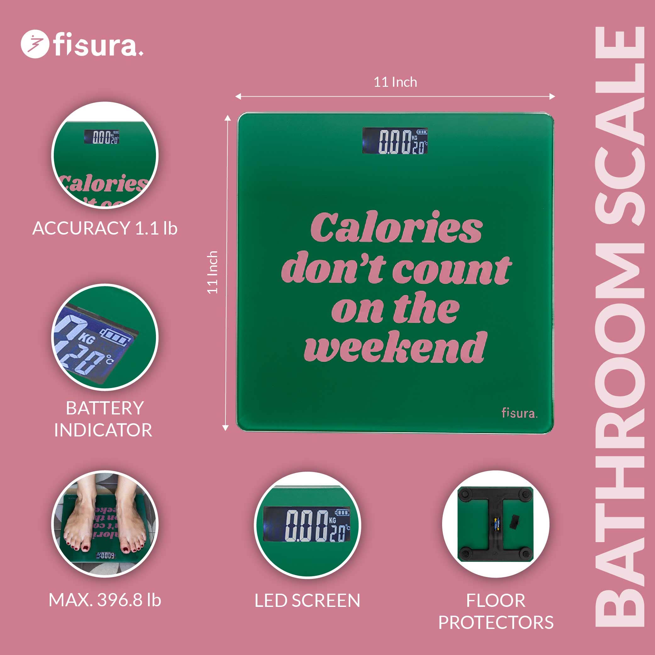 Digital bathroom scale "calories don't count". Glass bathroom scale. Electronic bathroom scale up to 180 kg and 50 g precision, Step-On technology. 30 x 30 cm